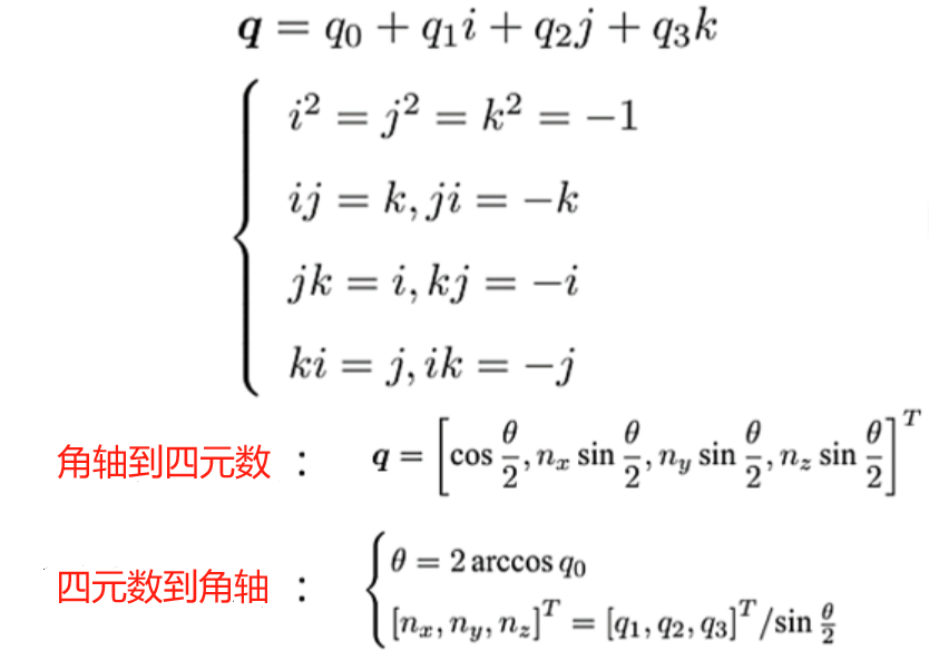 四元数:三维情况下,四元数可作为复数的扩充,具有三个虚部和一个实部。四元数相比于角轴、欧拉角的优势:紧凑、无奇异性。且四元数与角轴之间可以相互转换。