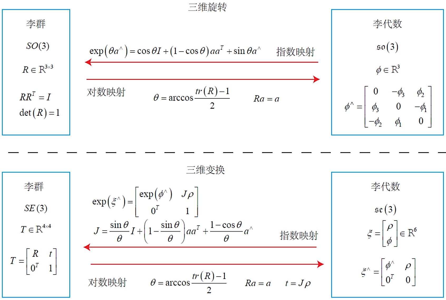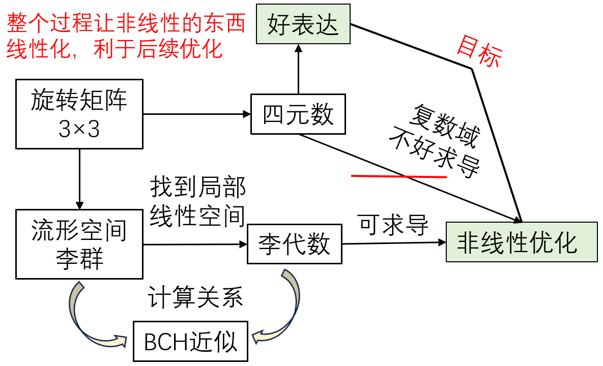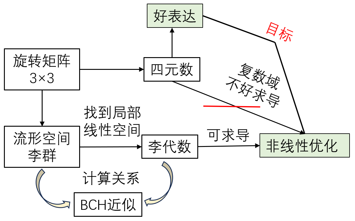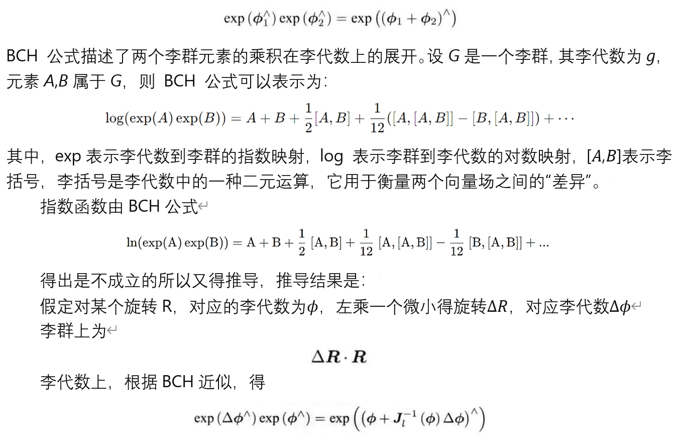 - 李代数与李群计算关系知道李代数和李群之间得对应关系是不够的,还需要知道怎么求导,以及李代数相加是怎么影响李群的。理想状态是李代数相加对应李群相乘