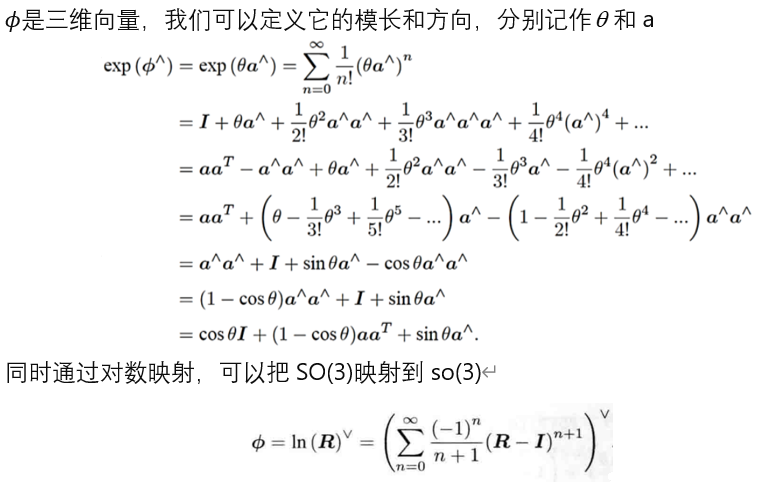 同时李群是流形,在数学中,流形是局部类似于欧几里得空间的空间,但在全局上具有更复杂的拓扑结构的对象。在流形上的每个点,我们可以定义一个与该点相切的线性空间,这个空间就是正切空间。正切空间是局部近似流形的一个线性空间,它包含了所有可能的在该点的切向量。正切空间可以看作是流形在某一点的“平坦”近似。根据流形的定义,我们知道李群可以在局部找到一个线性空间的同胚,且一一对应,同胚是在线性空间中,满足加乘的运算性质,就可以进行迭代优化了,那么现在问题就是如何找到这个一一对应的线性同胚。对于任意旋转矩阵R满足