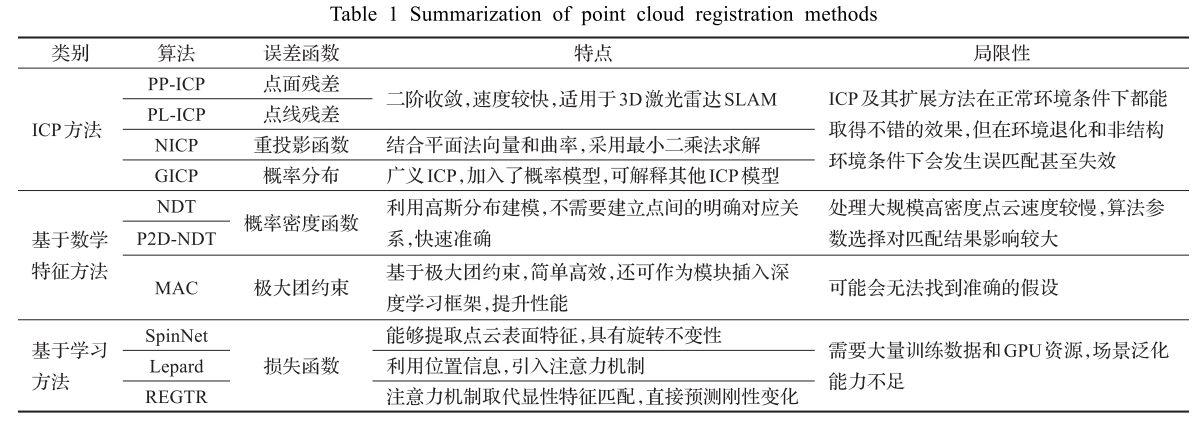 - 基于学习的方法基于深度学习的点云配准方法通过数据驱动方式学习,能获得比人工设计更精准的模型,但其模型的前 期训练和模型部署需要消耗大量的GPU资源,暂时无 法实现在CPU上的实时计算运行。1.FCGF提出一种全卷积几何特征,摆脱了先前SOTA方案需要低级特征输入的限制,但在对具有不同旋转分布的点云配准时效果不好;2.SpinNet:由一个空间点转换器和一个基于3D卷积神经网络的特征提取器组成,能够提取点云表面特征,具有旋转不变性3.Lepard:算法引入Transformer注意力机制,通过结合 RANSAC和ICP完成点云配准4.REGTR:使用注意力机制取代显性特征匹配和RANSAC,提出一个包含自注意和交叉注意的 transformer网络架构