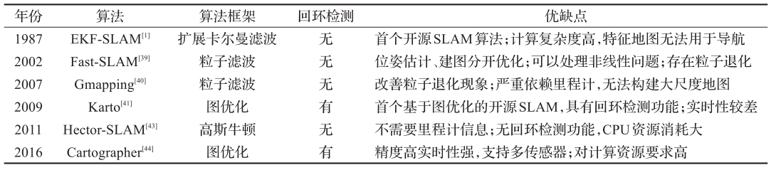 - GMapping:通过降低粒子数量的 方法大幅度缓解内存爆炸;采用选择性重采样方法,对粒子进行重要性权重排序,对权值低的粒子进行重采样,解决RBPF算法中粒子耗散问题。基于滤波的算法且无 回环检测,长时间运行存在较大累计误差,无法在室外 构建大环境地图。